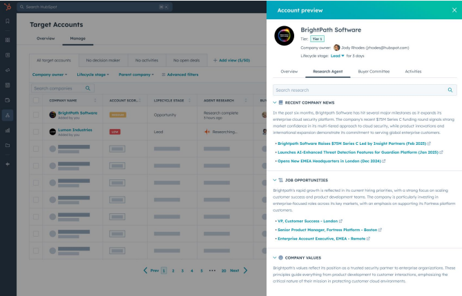 De Prospecting Agent van Breeze automatiseert accountonderzoek en gepersonaliseerde outreach op schaal. De agent help je met het versnellen van de betrokkenheid en het opschalen van jouw outbound-activiteiten. Zo kun jij je concentreren op de accounts met de meeste potentie.